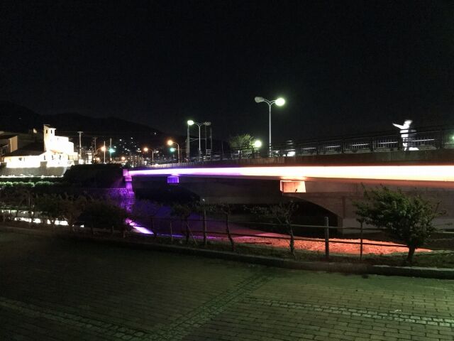 駅から歩いて10分ほど温泉街の中心あたりにある「ふれあい橋」へ