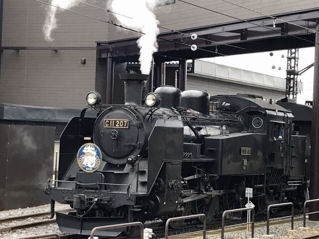 朝7時過ぎに最寄駅から電車に乗り込み、途中の乗り換え駅「下今市」で乗り継ぎの間に本物の蒸気機関車に遭遇![]()
